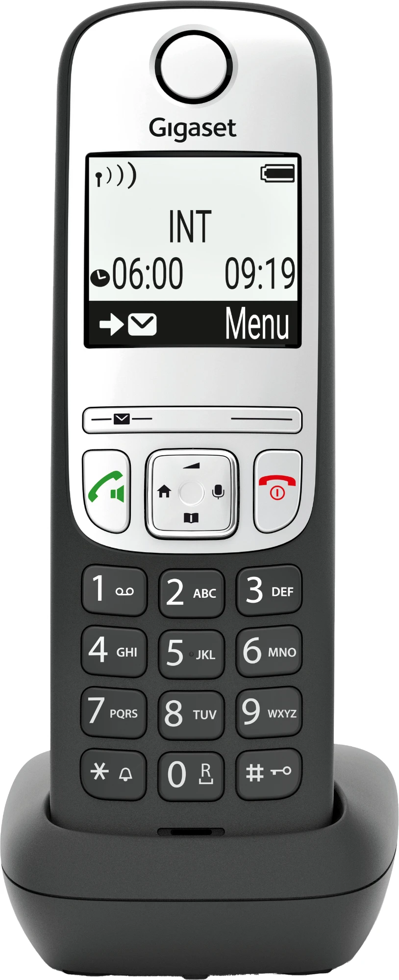 Was am Gigaset A690 zuerst ins Auge sticht, dürfte das große, beleuchtete Schwarz-Weiß-Grafik-Display sein. Das hat viele Vorteile: Der starke Kontrast von schwarzer Schrift auf weißem Hintergrund oder die große Ziffernanzeige im Wählmodus zielen bewusst darauf ab, das Bedienen noch einfacher für Sie zu machen. Zusätzlich sorgt eine ergonomische Tastatur mit beleuchteten Tasten und intuitiver Handhabung für hohen Komfort beim Telefonieren.